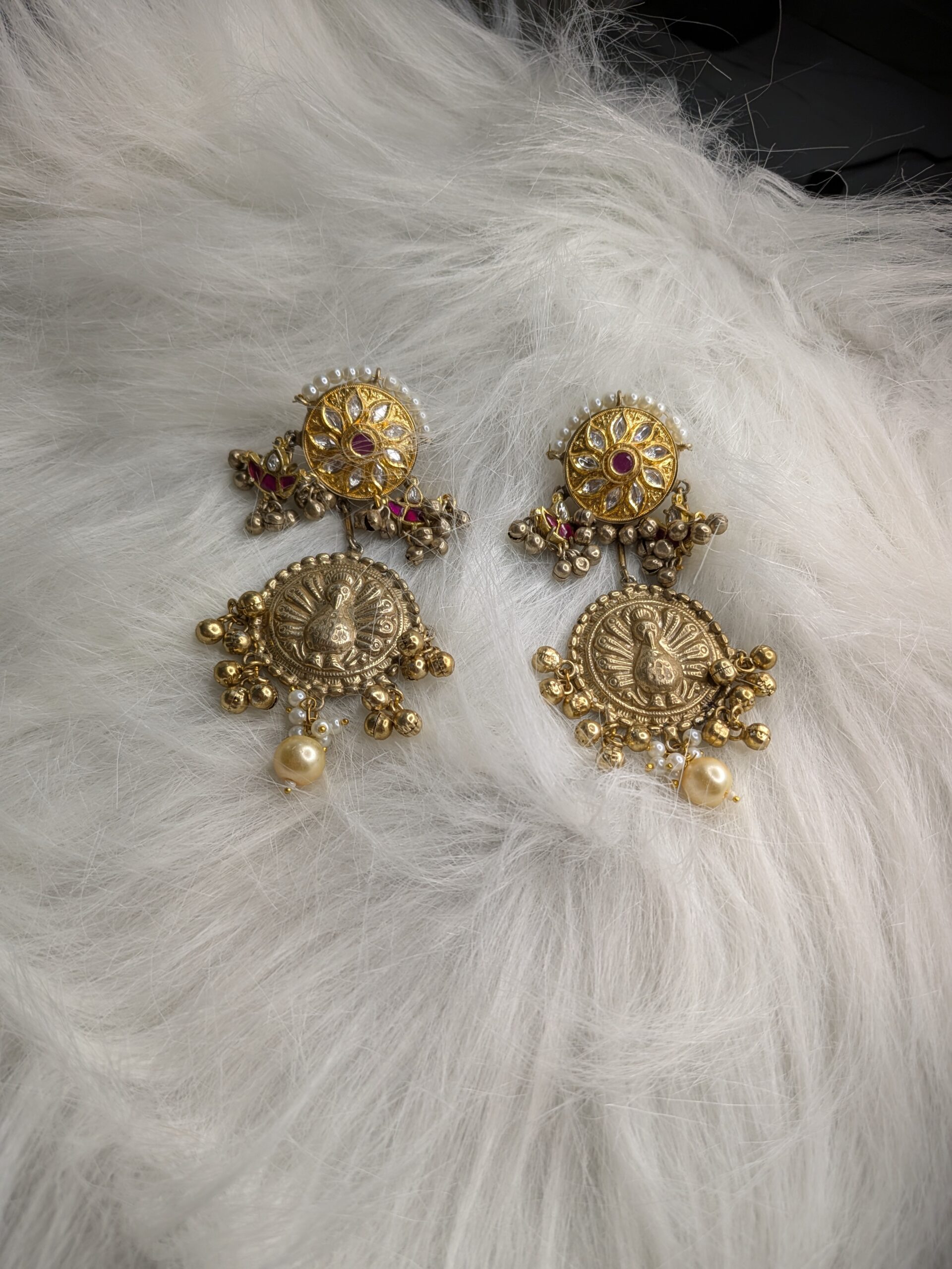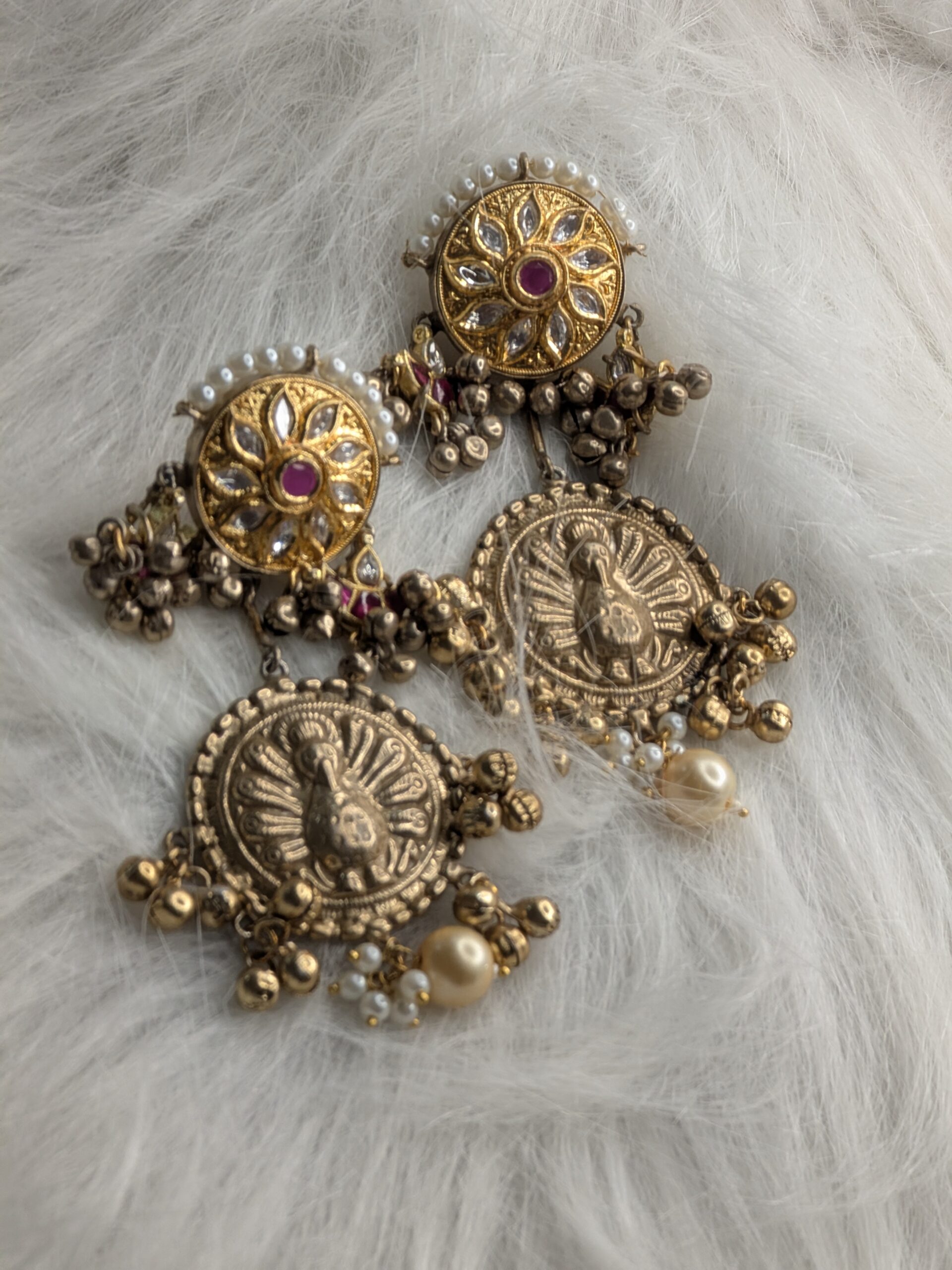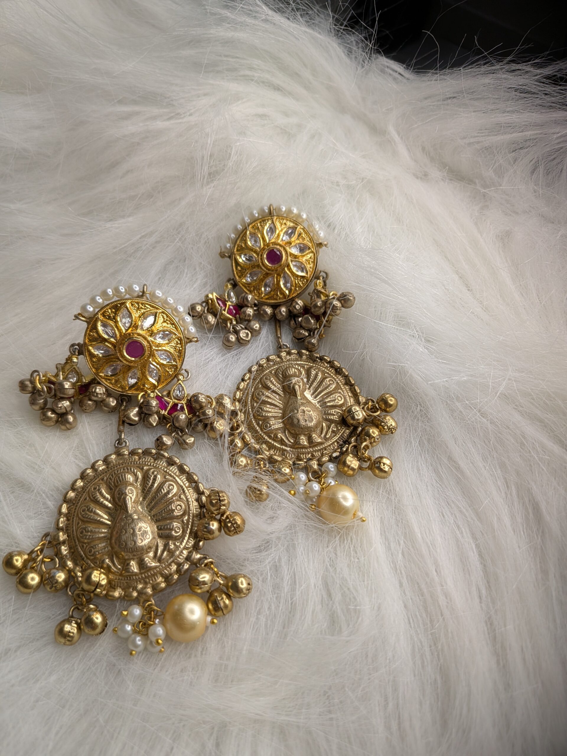 Let elegance dance with tradition in these Peacock Grace Antique Earrings. Featuring a beautifully embossed peacock design, accented with gold-toned beads, pearls, and a floral motif top, these earrings bring a touch of royalty to any look. Lightweight yet eye-catching — perfect for festive or ethnic wear!